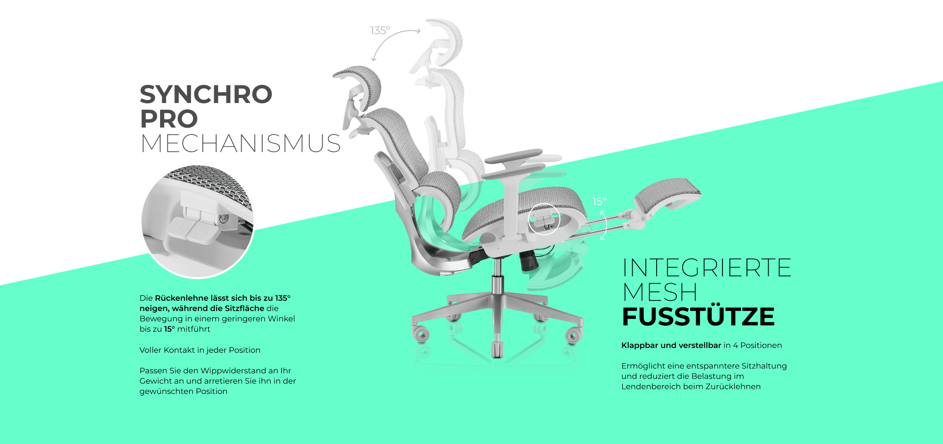 In 5 Positionen bis 135° neigbar, synchronisiert mit der Sitzfläche - Reposacabezas