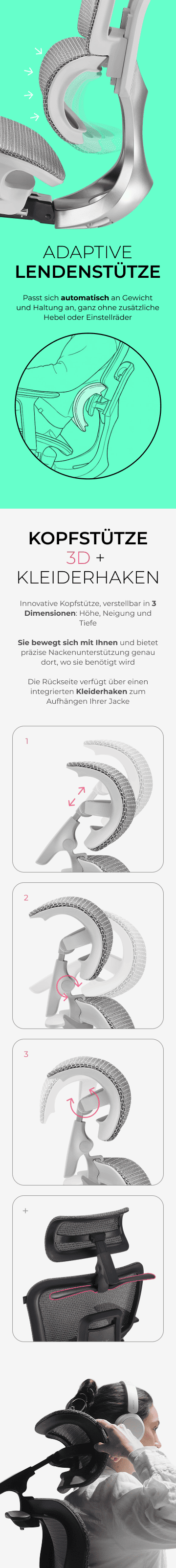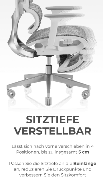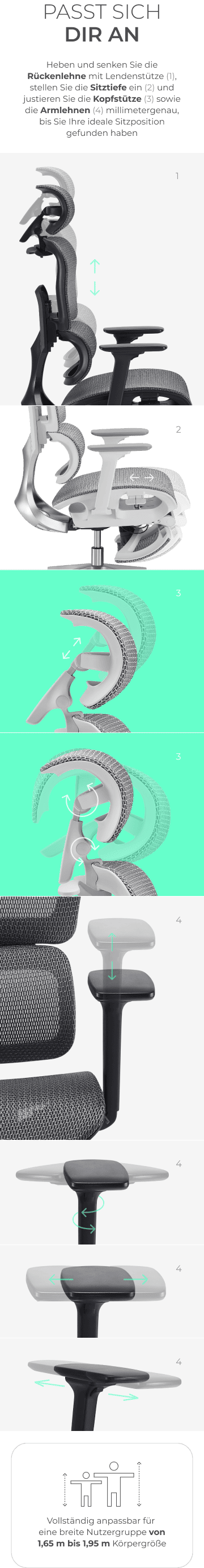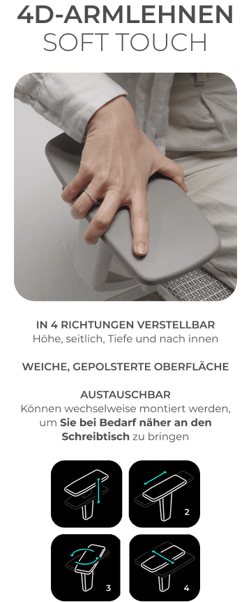 MYLA passt sich Ihnen an. Rückenlehnenhöhe, Sitztiefe, 3D-Kopfstütze und 4D-Armlehnen lassen sich individuell einstellen. Das atmungsaktive Flextex-Mesh passt sich dem Körper schrittweise an, während die synchronisierte Neigung jede Bewegung natürlich begleitet. Die integrierte Fußstütze ermöglicht einen einfachen Positionswechsel.