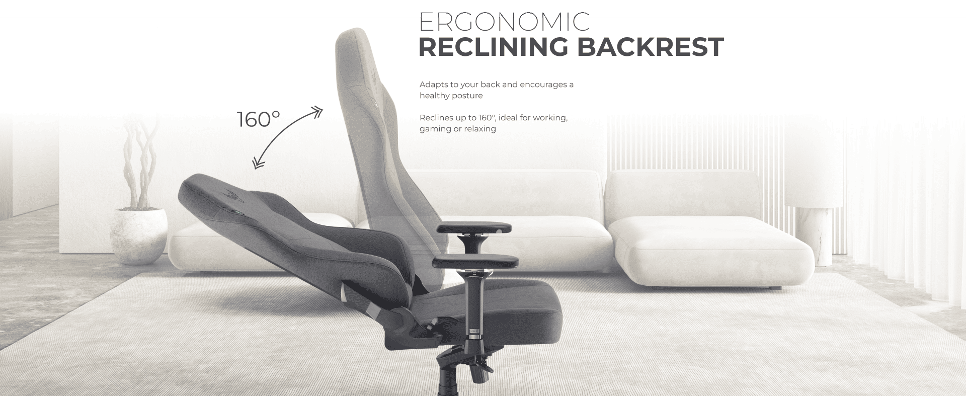 A premium fabric gaming chair — sober and refined — created for those who seek comfort and performance at the highest level.