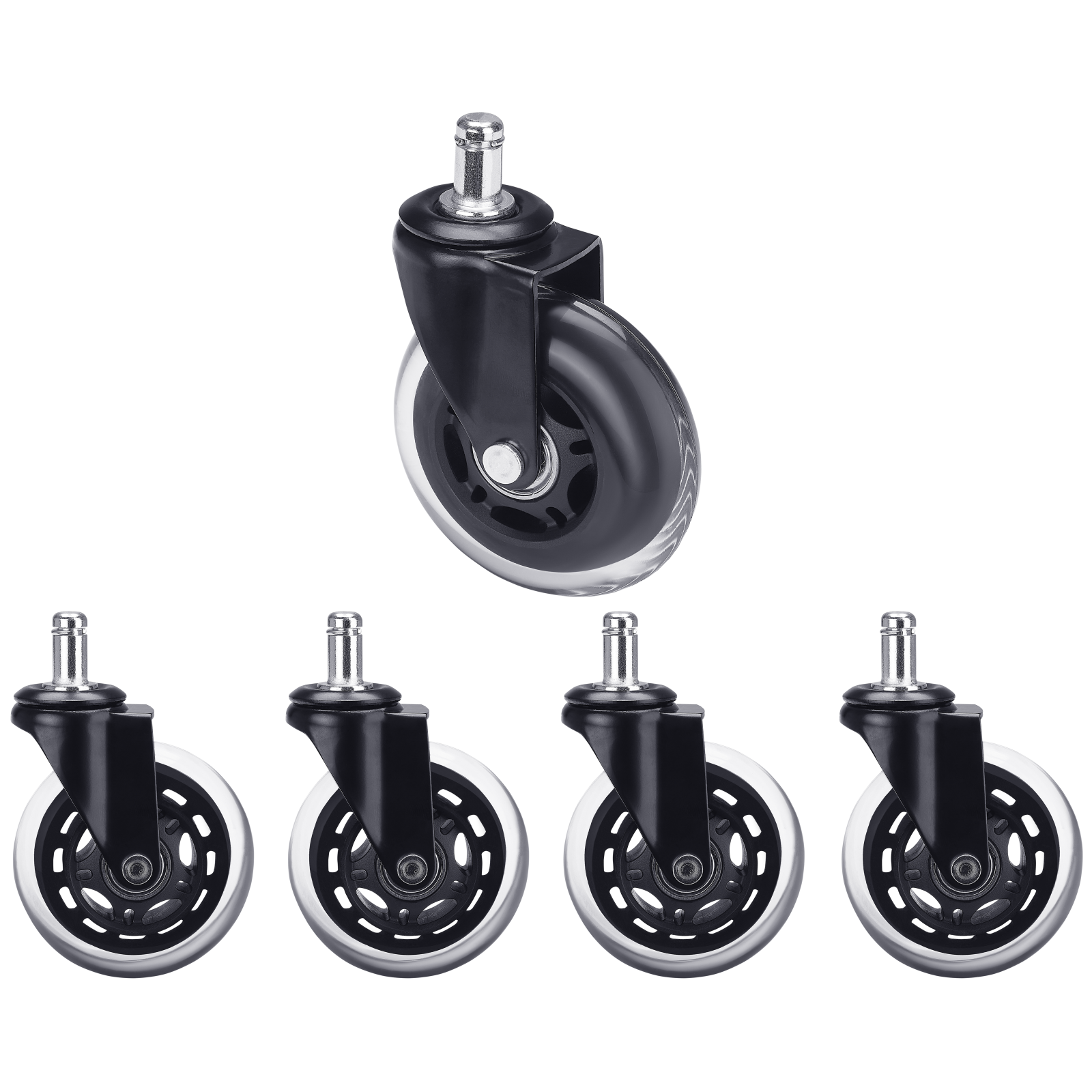 Give it a sporty touch and get smooth movement with this set of 5 universal replacement castors for gaming chairs, office chairs or desk chairs. These are our best rubber chair castors, designed not to damage soft floors such as parquet. Durability is guaranteed thanks to the sturdy steel construction.