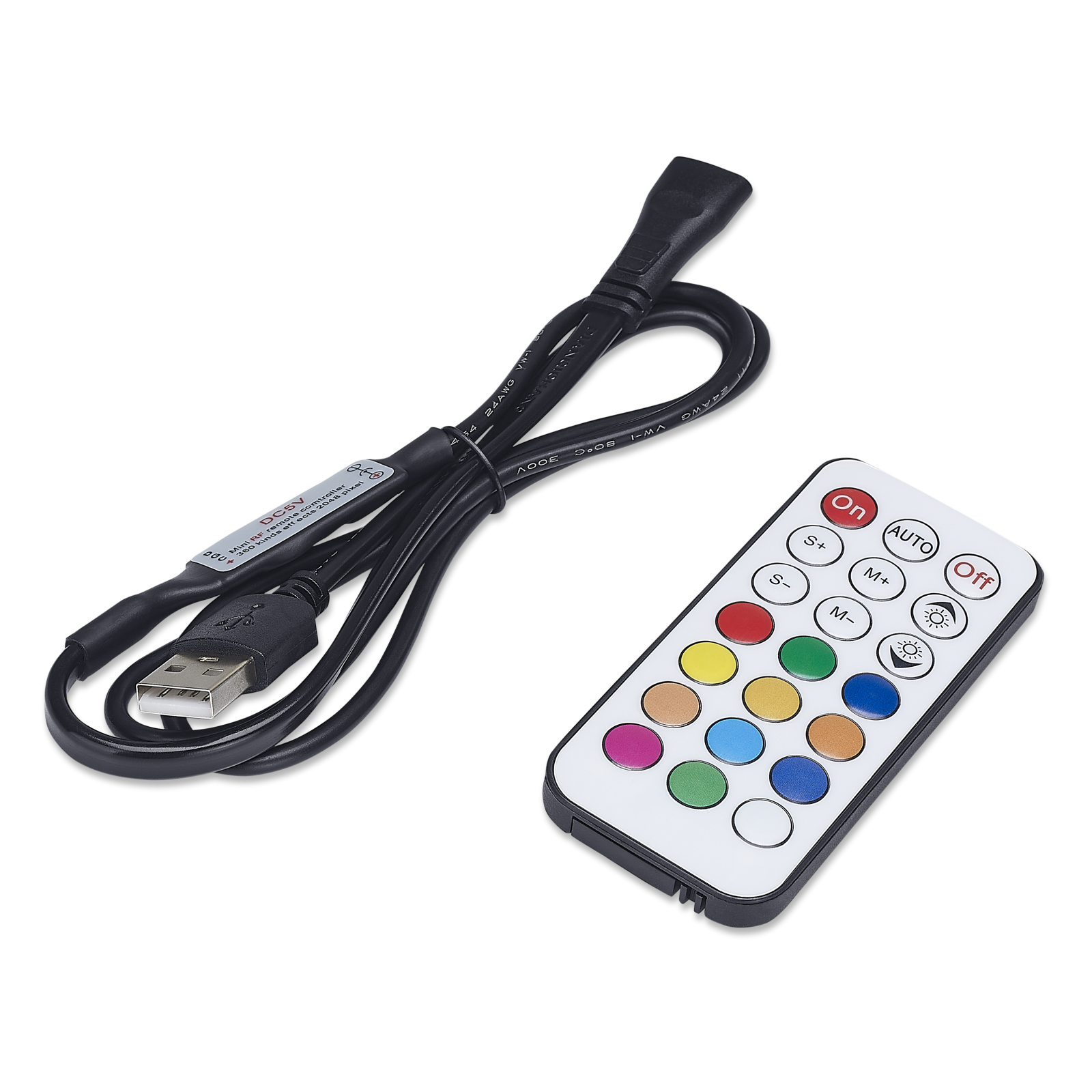El control remoto tiene 12 botones para colores fijos, modo automático y modo manual y controles para regular la velocidad y la intensidad de las luces.
